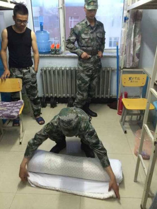 在军训期间,教官对学生内务要求做了详细说明,并为学生做了现场示范。从整理床铺到摆放各类生活用品都一一展示,并在整理的过程中耐心地向同学们讲解物品的整理方法和要求。教官还向学生阐述了整理内务的重要性,严格要求大家认真整理内务,并养成良好的生活习惯,为后的精致生活打下良好基础。