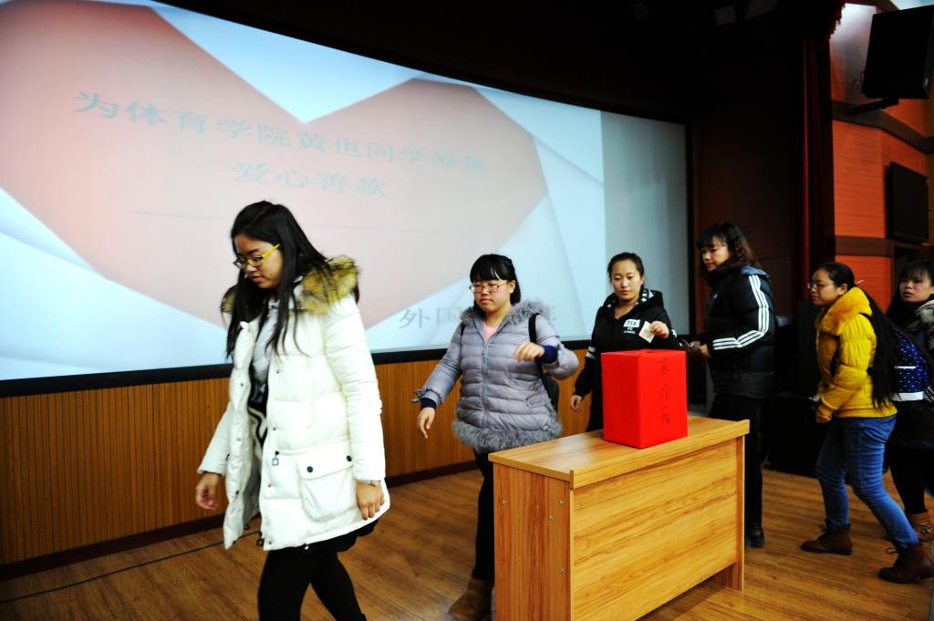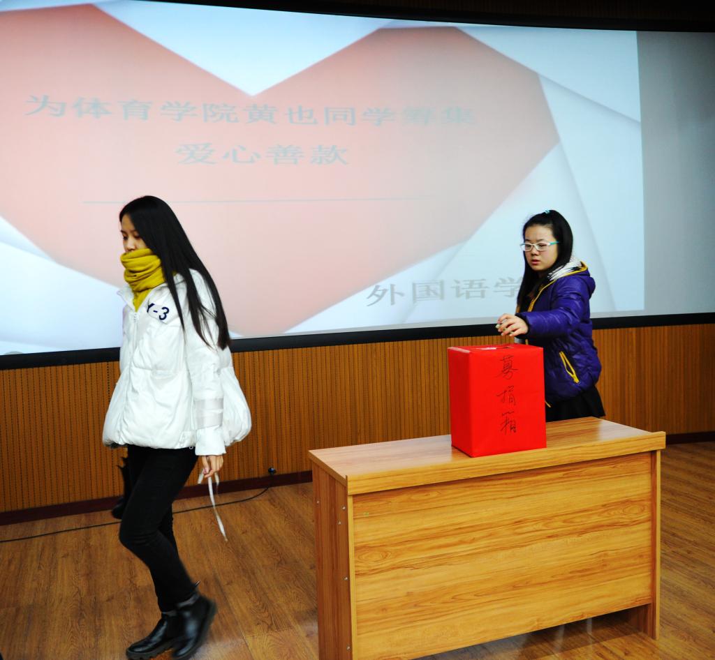 仪式由青年志愿者联合会主席赵一博主持,赵一博主席向同学们讲述了黄也同学的遭遇后,同学们都表示要奉献出自己的一份力量。捐款是以募捐箱的形势举行的。首先由各班班长率先代表班级捐款,随后由先进党员、入党积极分子及全体学生会成员自由捐款,同学们为了让黄也同学能早日回到我们的身边都献出了自己的一份爱心。