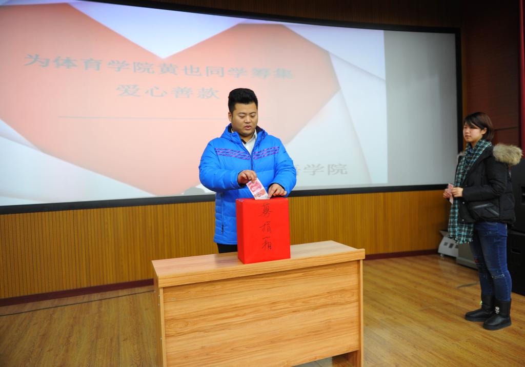 当我们伴着冬日的阳光,快乐的享受生活时,有一个生命在痛苦挣扎,在与死神搏斗;有一家人在痛哭中流泪,在为昂贵的医药费而奔波劳累,他就是体育学院的黄也同学,命运似乎和这年仅19岁的男孩开了一个玩笑:一向活泼开朗的他前段时间感觉身体,被父母送去医院,被确诊患有“骨癌”。这一消息如晴天霹雳,给他父母带来沉重的打击,而高昂的治疗费用,更是将这一个普通的家庭陷入了绝境。病魔无情人间有爱,11月17日3344555全新讯网官方网三大组织在俄语楼小剧场举行了“向体育学院的是黄也同学献爱心”的捐款仪式。