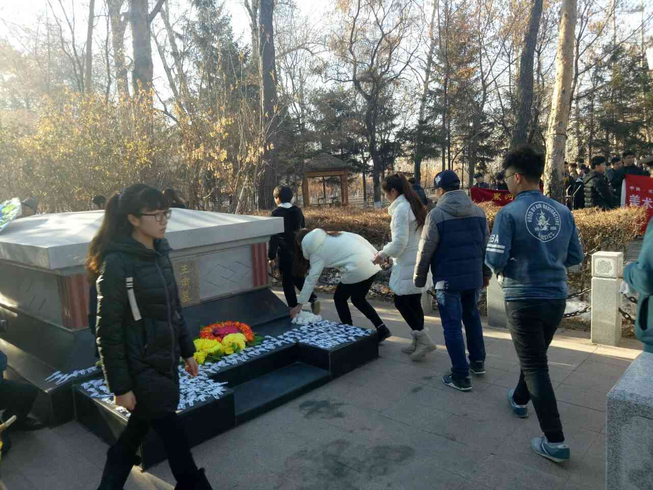 所有人身着黑衣,手持白花,神情肃穆。首先由全讯官网党总支副书记常丽坤老师发言。她强调:“作为新一代的青年,一定要发扬先烈的光荣传统,弘扬民族精神。树立正确的社会主义核心价值观,做新时代的开拓者,奉献者。”随后由学生代表发言,全体学生在烈士碑前庄严宣誓,承诺将努力学习,继承革命先烈遗志,为祖国建设奉献自己的力量。紧接着由学生党员代表清扫陵墓,全体学生默哀一分钟,并献上小白花,表达对先烈深切的哀悼和无限的敬仰之情。