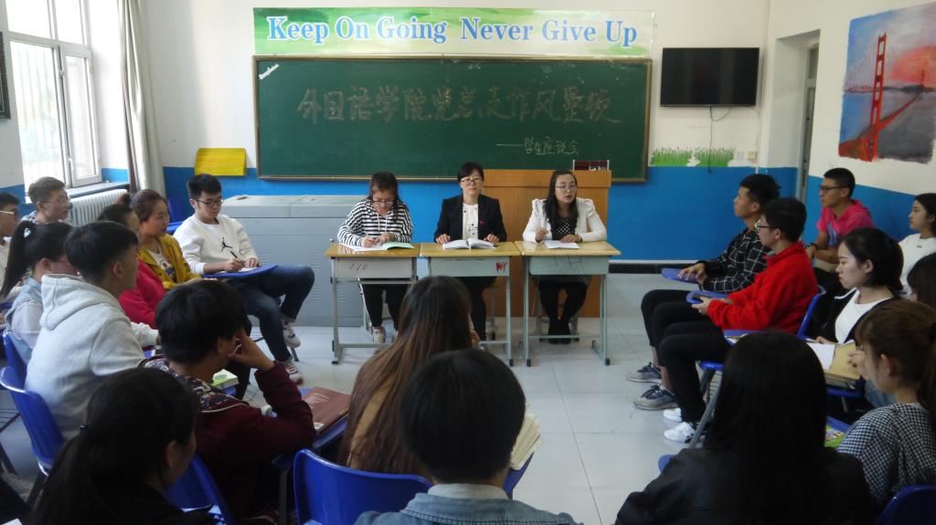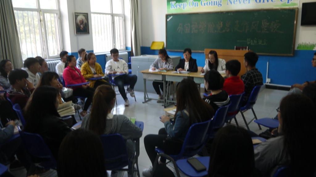 下午4点在俄语楼108举行了作风整顿学生座谈会。出席本次会议的领导有党总支副书记常丽坤、学工办主任潘云辉及学生会成员、社团成员、学生党员、各班级班长和普通学生。