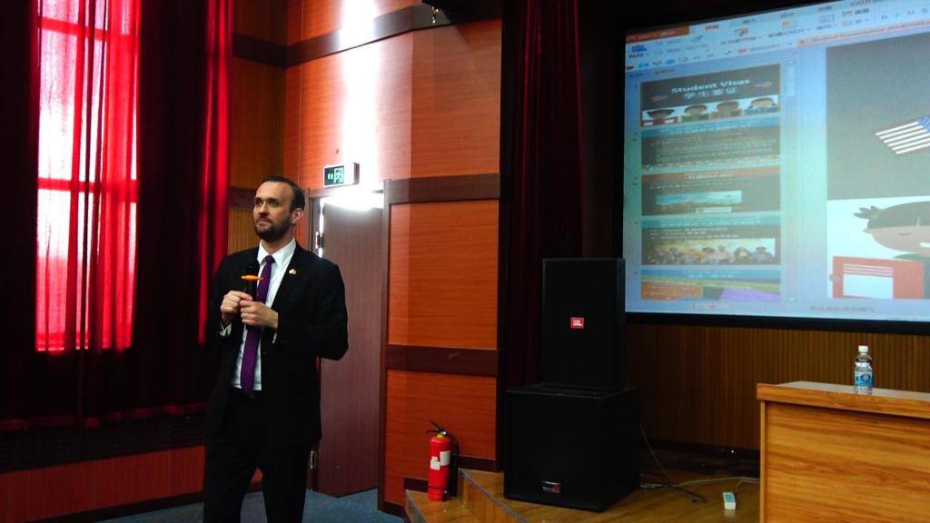 2018年4月17日下午,美国驻沈阳总领事馆签证处副领事艾文×布朗先生为全讯官网英语专业学生了介绍如何赴美留学申请以及办理学生签证相关问题。本次讲座由3344555全新讯网官方网副院长戈秀兰主持。英语系2015级、2017级全体同学参加了这次讲座。