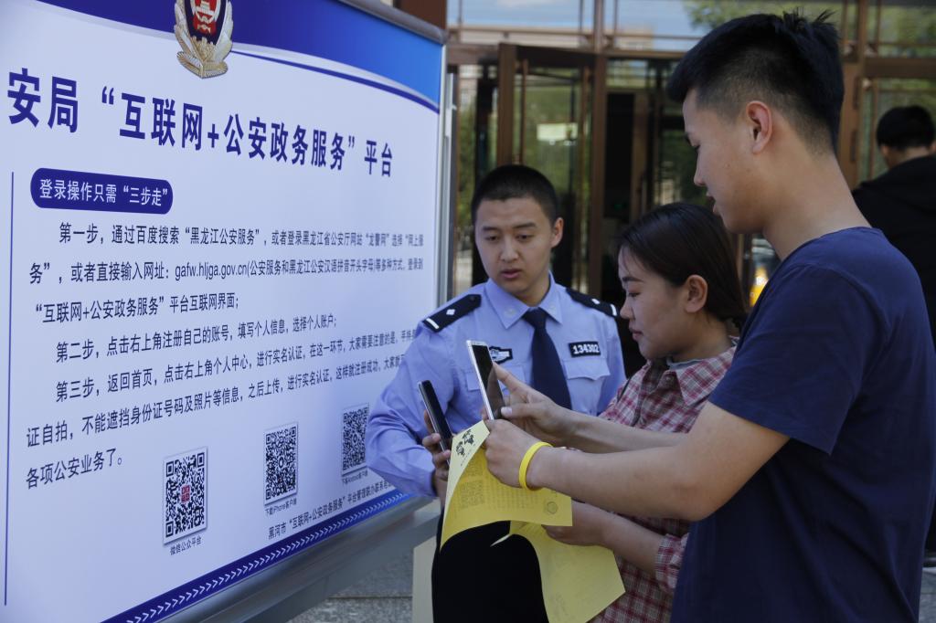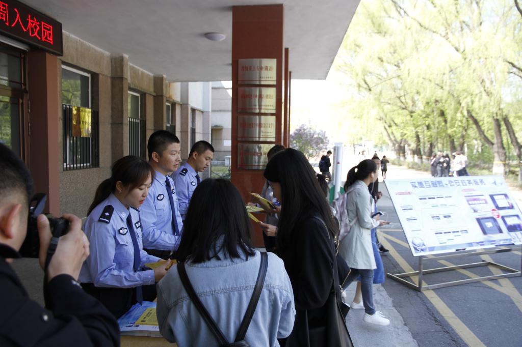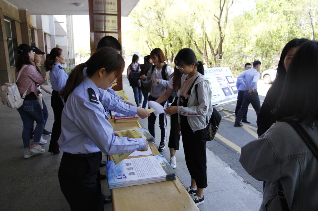 2018年5月18日9时,黑河市公安厅代表团来我校宣传“互联网+公安政务服务”平台正式上线运行,3344555全新讯网官方网辅导员郗亚凡代领学生代表于俄语楼门前进行学习。