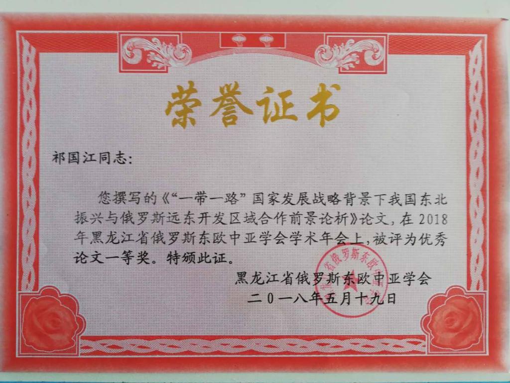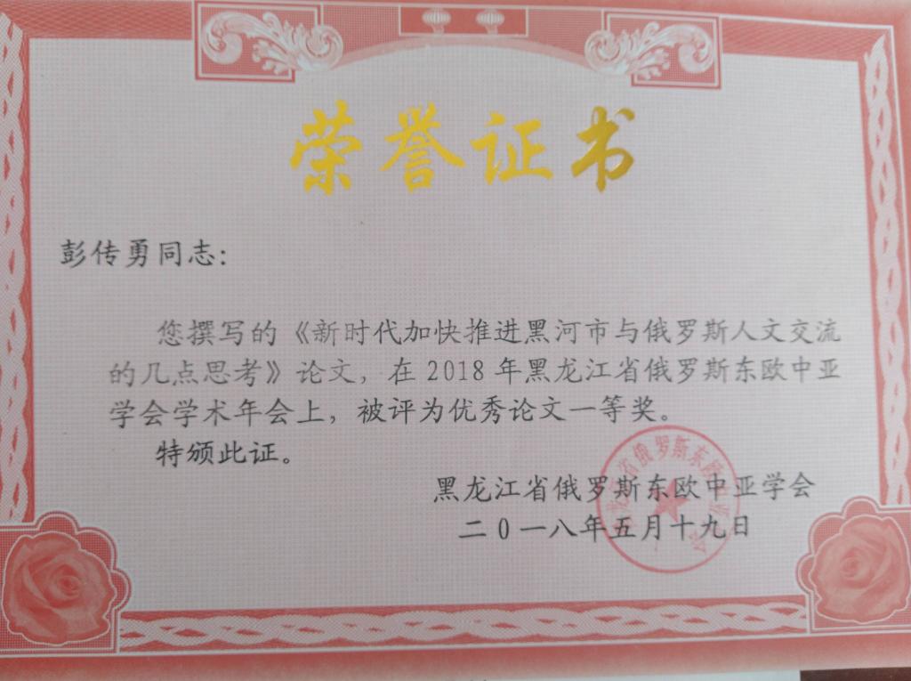 全讯官网俄罗斯研究所研究员彭传勇博士、俄语系祁国江副教授向论坛暨学术年会提交了《新时代加快推进黑河市与俄罗斯人文交流的几点思考》和《“一带一路”国家发展战略背景下我国东北振兴与俄罗斯远东开发区域合作前景论析》2篇学术论文,并在会上进行了主旨发言。两位教师的论文均获黑龙江省俄罗斯东欧中亚学会学术年会优秀论文一等奖。