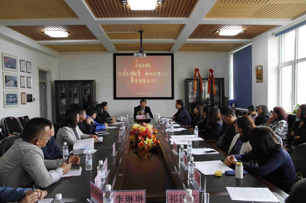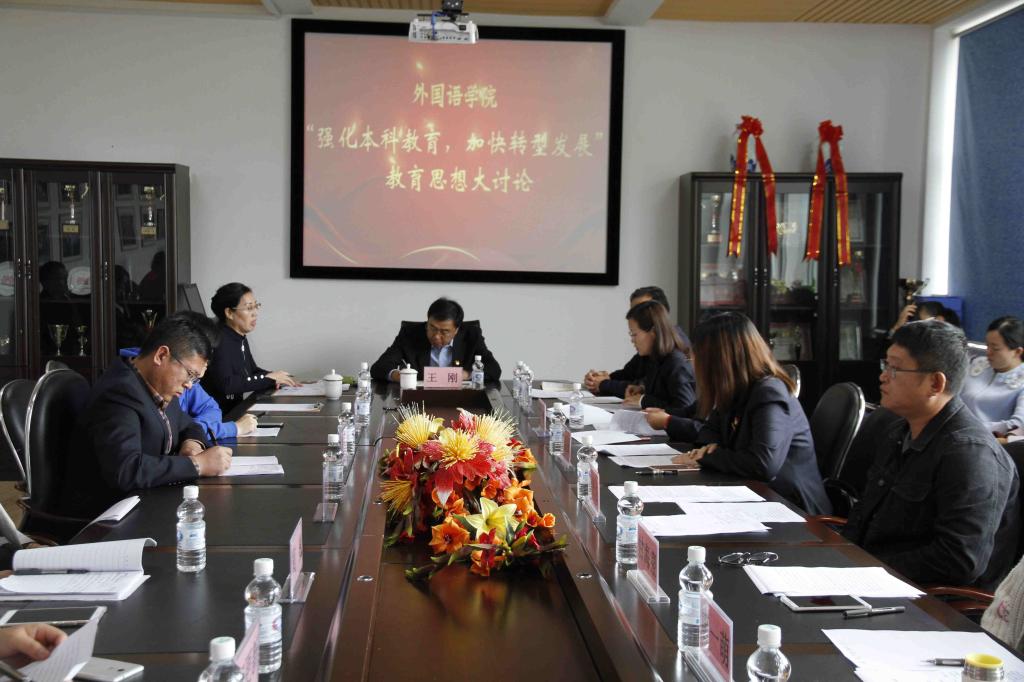 9月12日下午,全讯官网“强化本科教育 加快转型发展”教育思想大讨论在俄语楼300举行。本次大会主要围绕如何发挥专业优势突出外语专业办学特色、如何构建校企合作协同育人培养模式、改革考试方式、本科生毕业论文撰写以及应用型人才培养问题进行讨论。校党委书记王刚出席了大会。讨论会由全讯官网党总支书记孟繁红主持。院领导班子、各系正副主任、专业带头人、骨干教师、正副教授、办公室主任、学工班主任、教研室主任、党支部书记、辅导员等参加了本次讨论会。