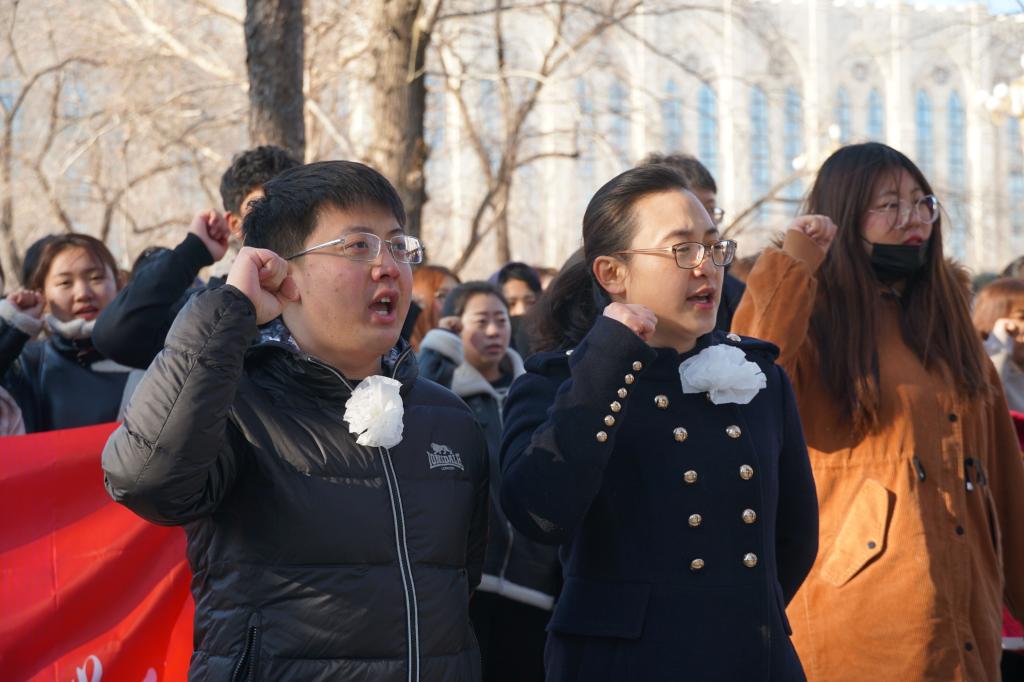 参加祭扫的同学们不畏黑河清晨的严寒,在这样的爱国主义教育活动中,他们受益良多,更表达对革命烈士哀思的同时,表示身为新时代大学生,应将个人理想融入国家理想,牢记使命、不忘先辈、砥砺前行。