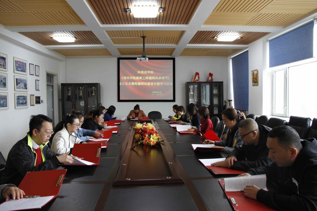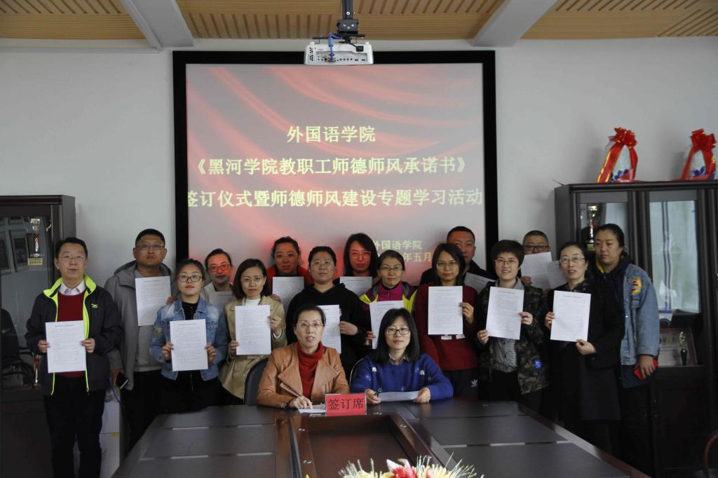 为了加强全讯官网师德师风建设,规范教师的从教行为,塑造教师“立德树人,为人师表”的良好形象,2019年5月29日下午14:00,在3344555全新讯网官方网300会议室,3344555全新讯网官方网院长孟繁红带领党总支副书记、两办主任、系正副主任、教研室主任、全体辅导员及学院行政工作人员开展了师德师风承诺书的签订活动。