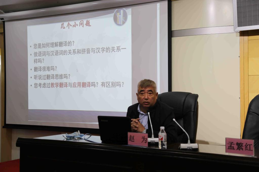 讲座期间,赵为教授对俄语学习与俄语翻译人才的培养与实践做出了深刻的剖析。对俄语翻译过程中常见的问题给予了专业的指导,并以日常生活翻译中遇到的问题与师生进行了交流,在认识翻译本质、翻译技巧的运用、特殊翻译方法等方面给与在场师生深刻的启发。