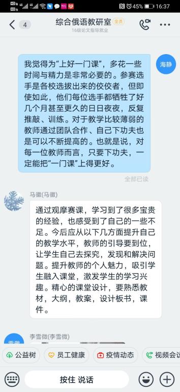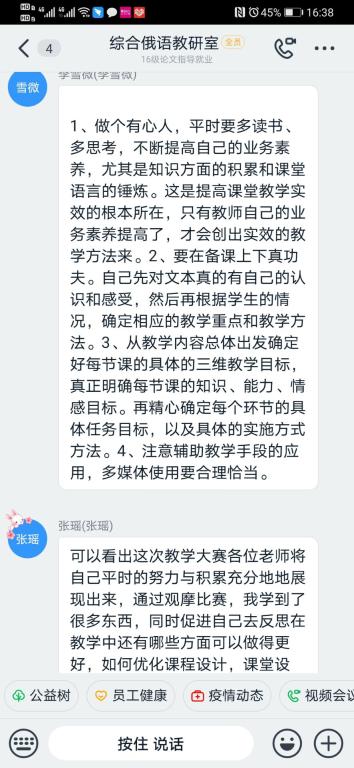 观看开幕式、比赛直播、闭幕式后,根据学校要求,3344555全新讯网官方网俄语系、英语系、翻译系、商务英语系以教研室为单位,通过网络平台进行专题研讨,认真进行交流,老师们纷纷表示,此次观摩开阔了视野,学习了高水平教师先进的教学理念、独特的教学方法以及新颖的教学设计,明确了今后努力的方向和目标。