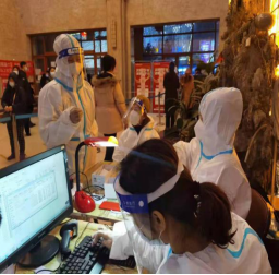 2019级俄本一班李晓彤同学在河北省石家庄市裕华区宋营镇丽美家园社区担任志愿者,主要担任全民核酸检测时居民信息登记工作。