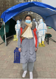 2018级英语翻译班同学于佳鑫,在哈尔滨市南岗区新春民建社区进行志愿服务工作,其主要工作内容为在全民核酸检测过程中配合社区工作人员、组织群众、服务群众有序地进行该工作。