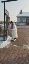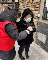 2020级英语师范一班刘姮铄同学寒假期间在黑龙江省齐齐哈尔市拜泉县做志愿者,主要工作是区民楼卡点执勤,配合物业工作,认真落实每个居民出门都须扫码登记测体温。