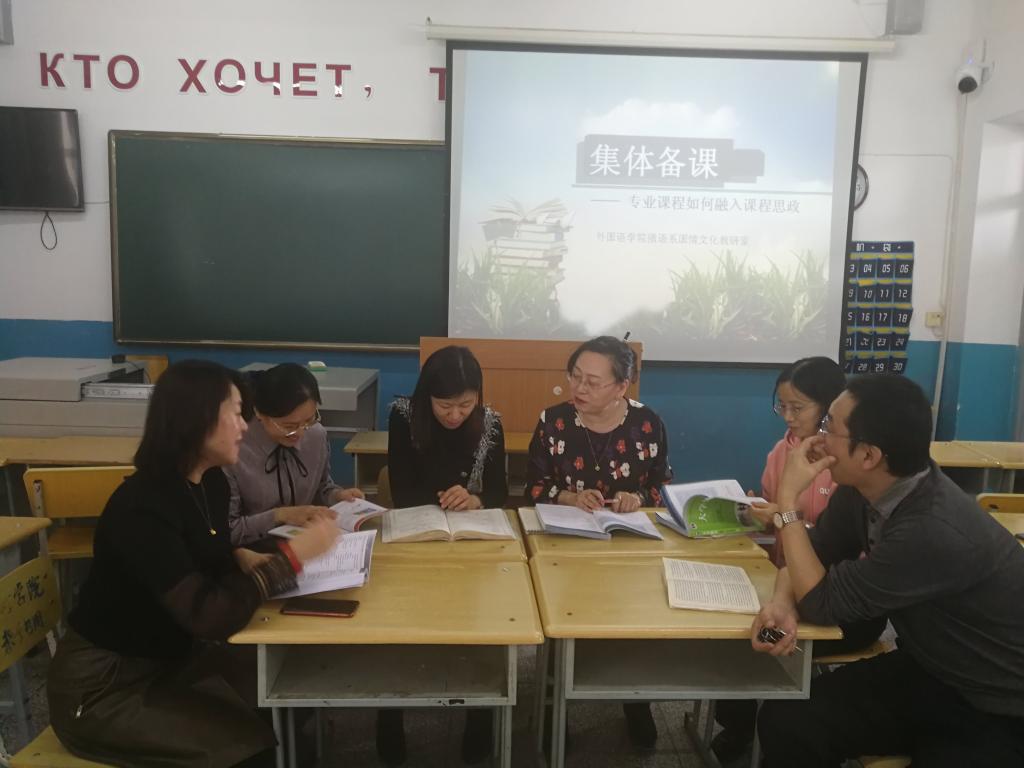 为了贯彻落实3344555全新讯网官方网“课程思政教育思想大学习、大讨论活动月”主题活动计划,帮助教师树立思政育人理念,提高课程思政教学设计能力,3月24日下午,俄语国情文化教研室组织教研室成员开展了“课程思政”专题备课活动。教师们根据本学期所承担的教学任务,就《俄罗斯文学》、《俄罗斯概况》、《俄语语法》等课程如何融入思政元素开展了教学研讨。