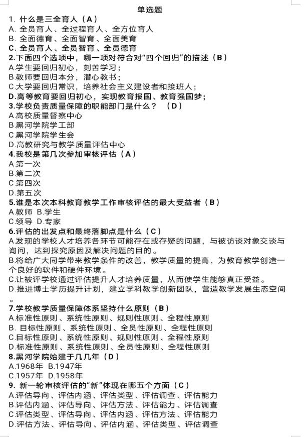 本次竞赛题目形式多样,内容涵盖校史校情、院史院情和本科教育教学审核评估常识等,全面检测学生对教育教学审核评估工作目标与内涵、学校、学院的发展历程、办学特色、专业建设、人才培养等多方面的知识掌握程度。突出“以评促建、以评促改、以评促管、评建结合、重在建设”的活动主题,同时营造了“人人关心评估、人人了解评估、人人参与评估、人人都是评估对象”的浓厚迎评氛围。