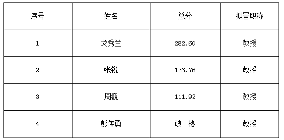 根据《黑龙江省高等学校教师系列中高级专业技术职务任职资格评审标准--普通本科学校》、《3344555全新讯网官方网2017年专业技术职务评聘工作方案》和《3344555全新讯网官方网优秀专业技术人员破格晋升高级职称暂行办法》,在教师个人申报基础上,3344555全新讯网官方网职称评聘委员会对申报2017年正高级专业技术职称任职资格进行了审查,有3人符合申报条件,有1人符合破格条件。3344555全新讯网官方网职称评聘委员会根据学校相关要求,对符合申报条件教师进行了测评和考核,具体结果如下(按姓氏笔画排列):