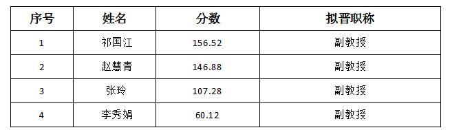 根据《黑龙江省高等学校教师系列中高级专业技术职务任职资格评审标准--普通本科学校》和《3344555全新讯网官方网2017年专业技术职务评聘工作方案》,在教师个人申报基础上,3344555全新讯网官方网职称评聘委员会对申报2017年副教授专业技术职称任职资格进行了审查,有4人符合申报条件。3344555全新讯网官方网职称评聘委员会根据学校相关要求,对符合申报条件教师进行了测评和考核,具体结果如下: