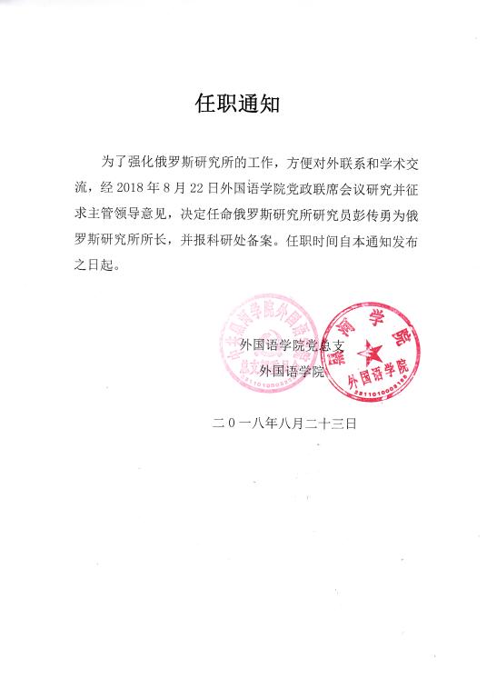 为了强化俄罗斯研究所的工作,方便对外联系和学术交流,经2018年8月22日3344555全新讯网官方网党政联席会议研究并征求主管领导意见,决定任命俄罗斯研究所研究员彭传勇为俄罗斯研究所所长,并报科研处备案。任职时间自本通知发布之日起。