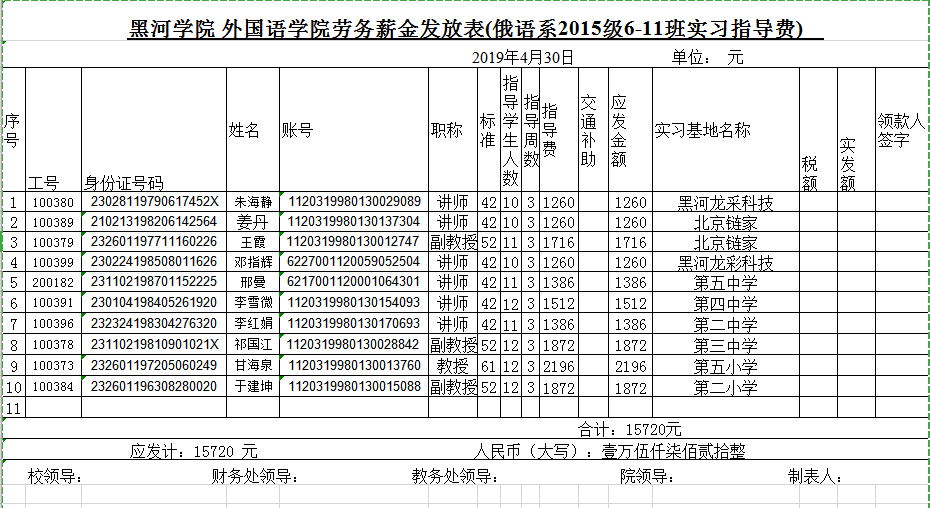 公 示(俄语系2015级6-11班实习指导教师指导费)